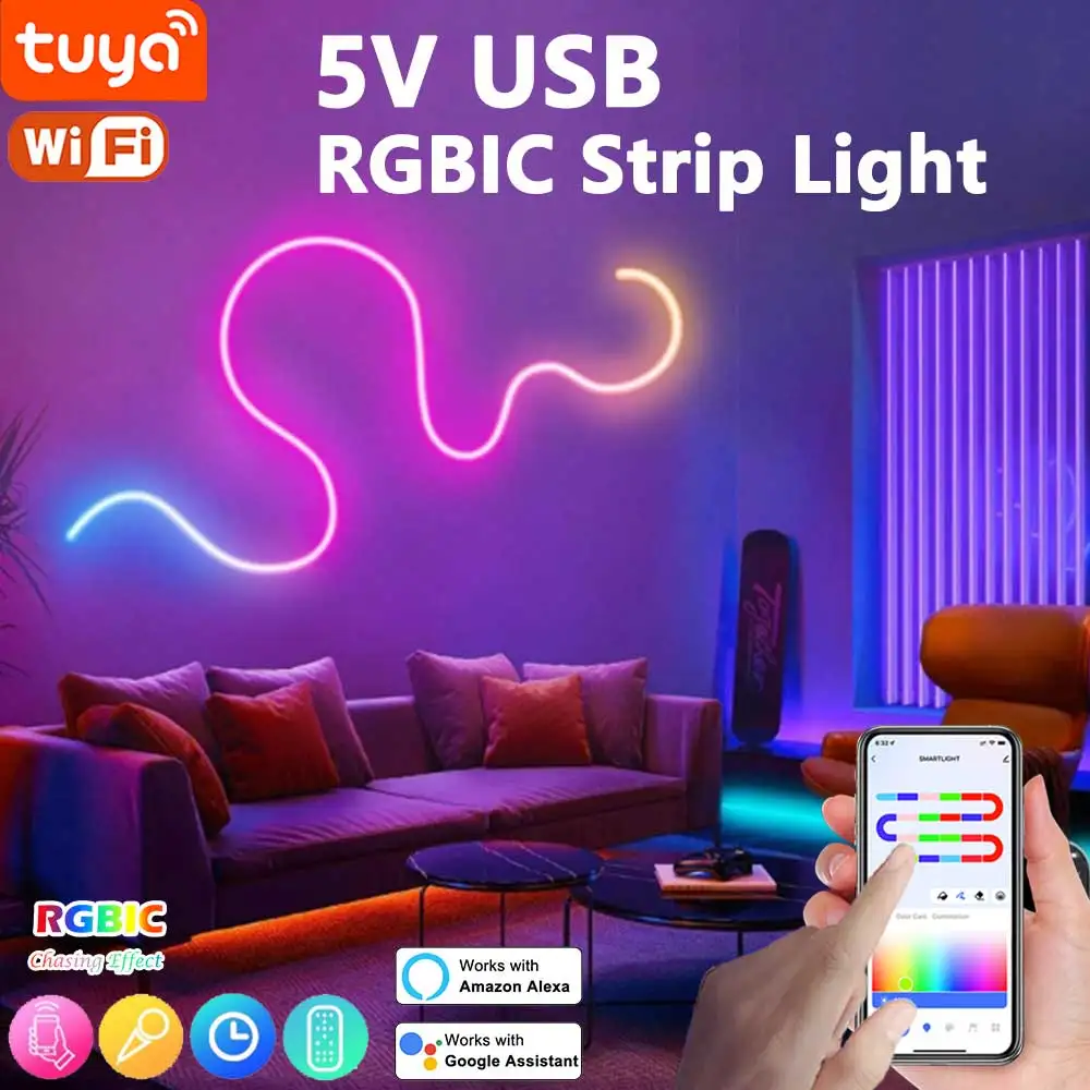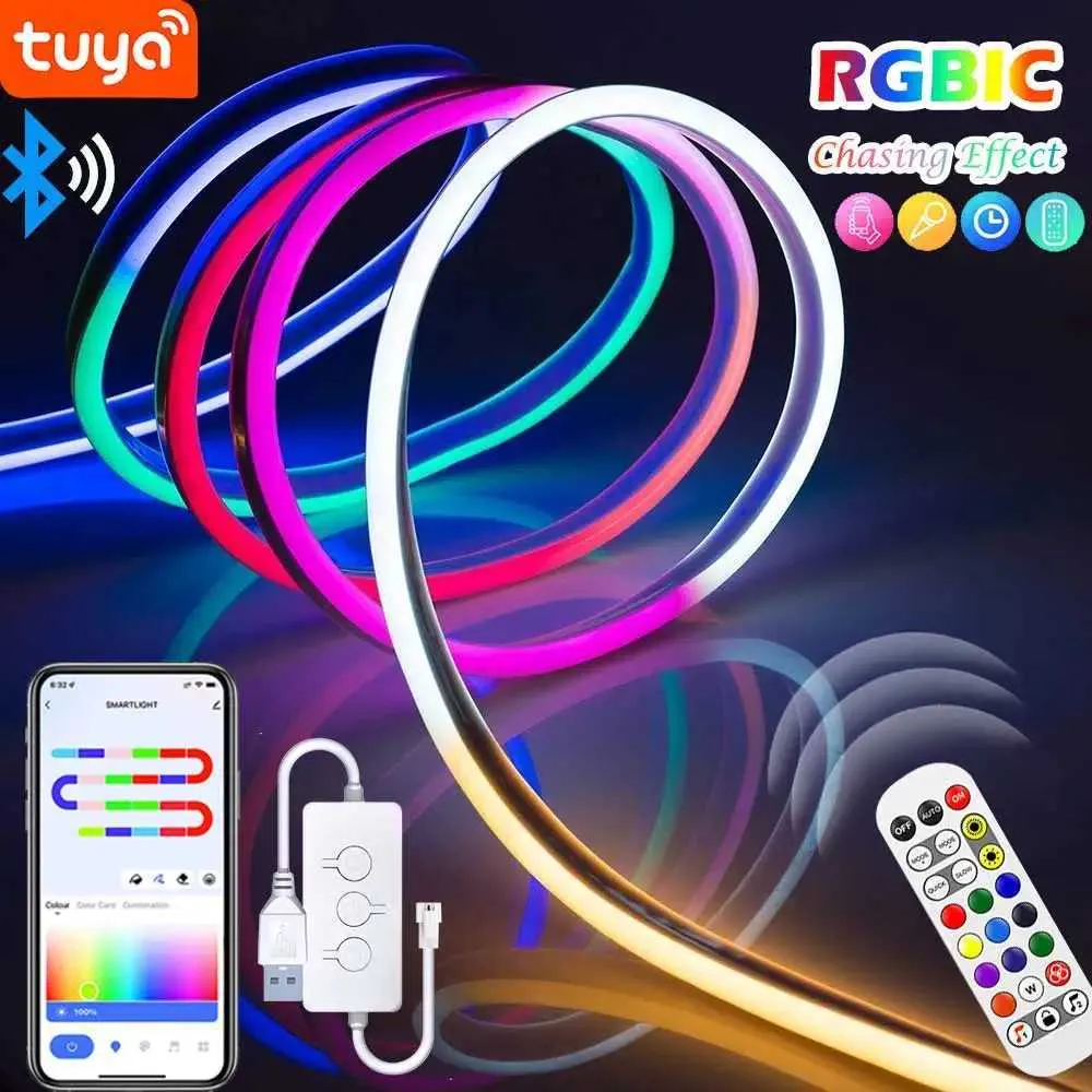 TUYA Neon LED Strip Lights 5V Neon Rope Light 72LEDs/M Silicone with Music Sync RGBIC Dreamcolor Chasing Strip Tape for Room